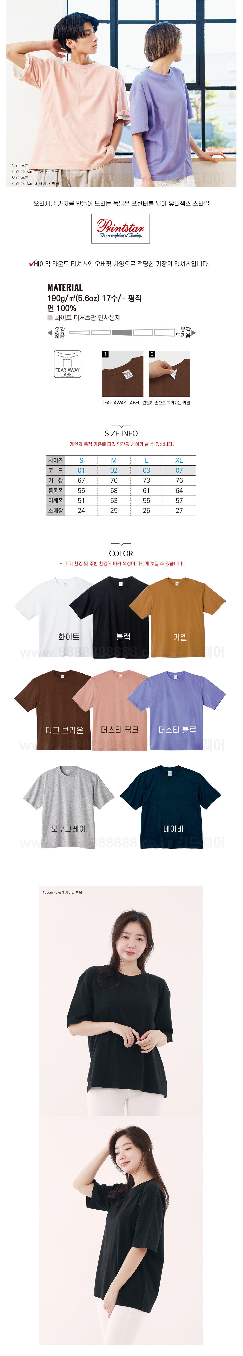 다양한 색상 표현의 한계)에 따라 티셔츠 및 인쇄 시안의 색상이 실제와 차이가 발생 할 수 있으므로 교환/반품/환불이 불가능합니다.