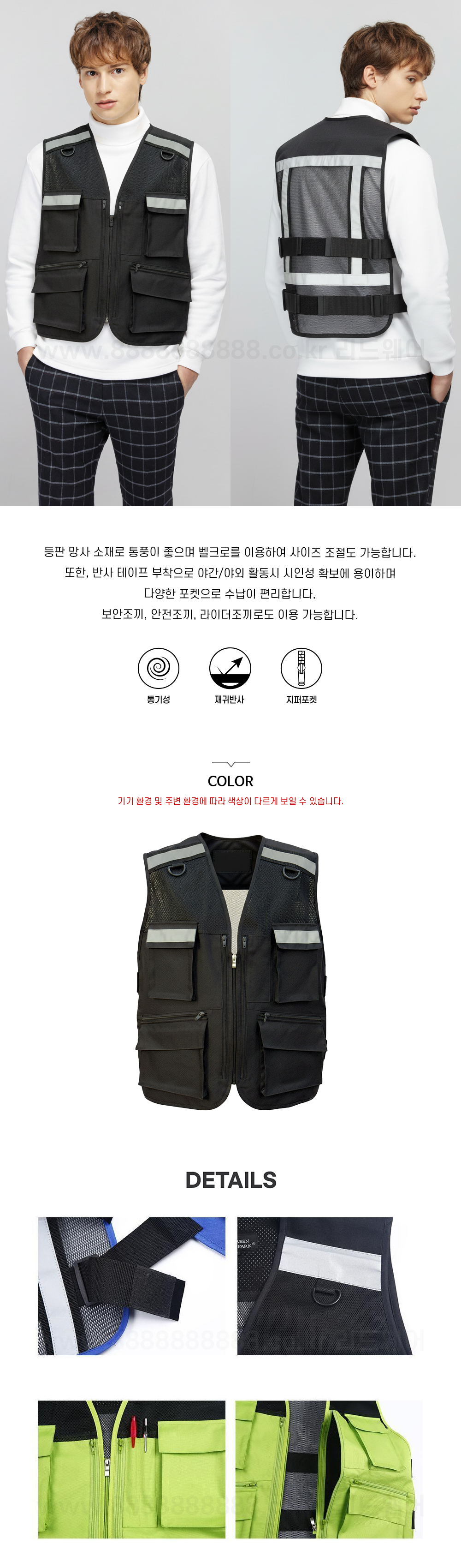 또한, 반사 테이프 부착으로 야간/야외 활동시 시인성 확보에 용이하며